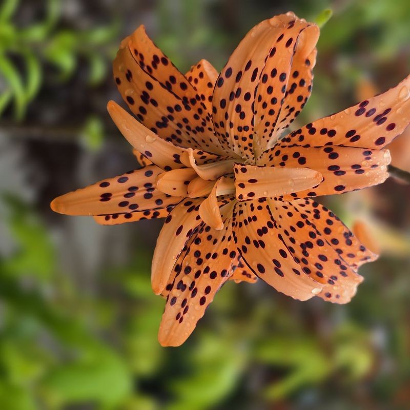 RARE. Forme à fleurs doubles, en pompons, LIS CHINOIS aux pétales récurvés ORANGE VIF, ponctués de NOIR portant jusqu’à 20 fleurs. FEUILLES ÉTROITES, LANCÉOLÉES VERT soutenu. Pousse en toute bonne terre, acide ou calcaire.